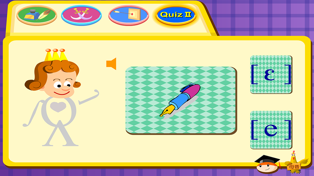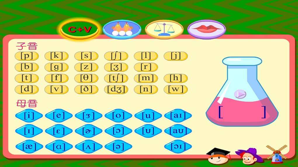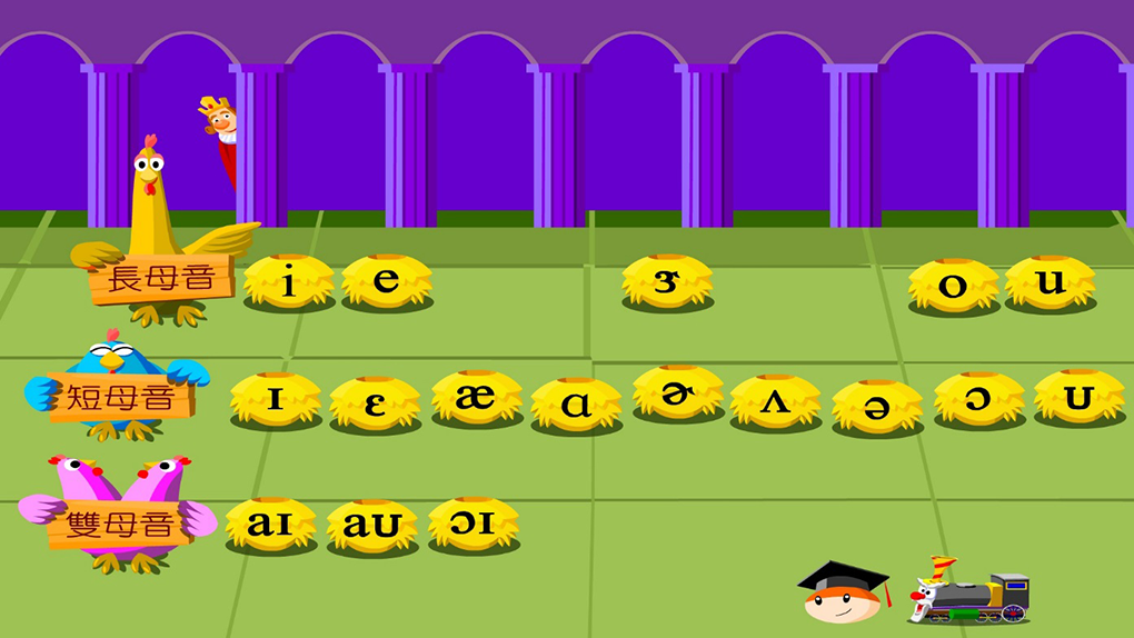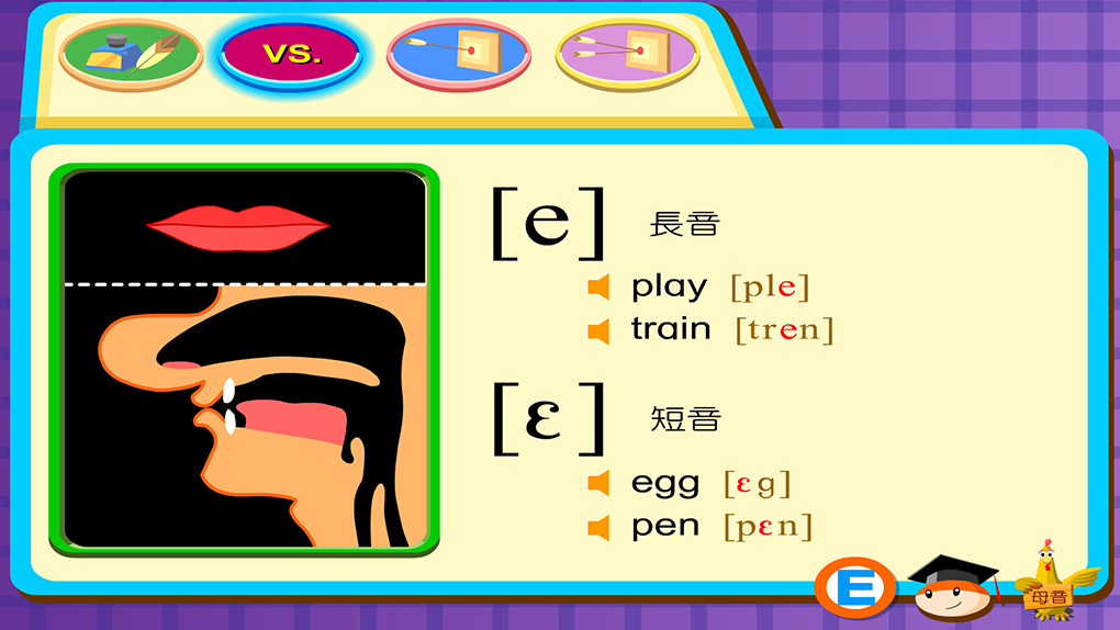 這個母音學習介面的設計,是根據長母音和短母音以及各個音符的嘴型發音部位,依序上下對位和左右排列,幫助孩子釐清相鄰音符的發音差異。