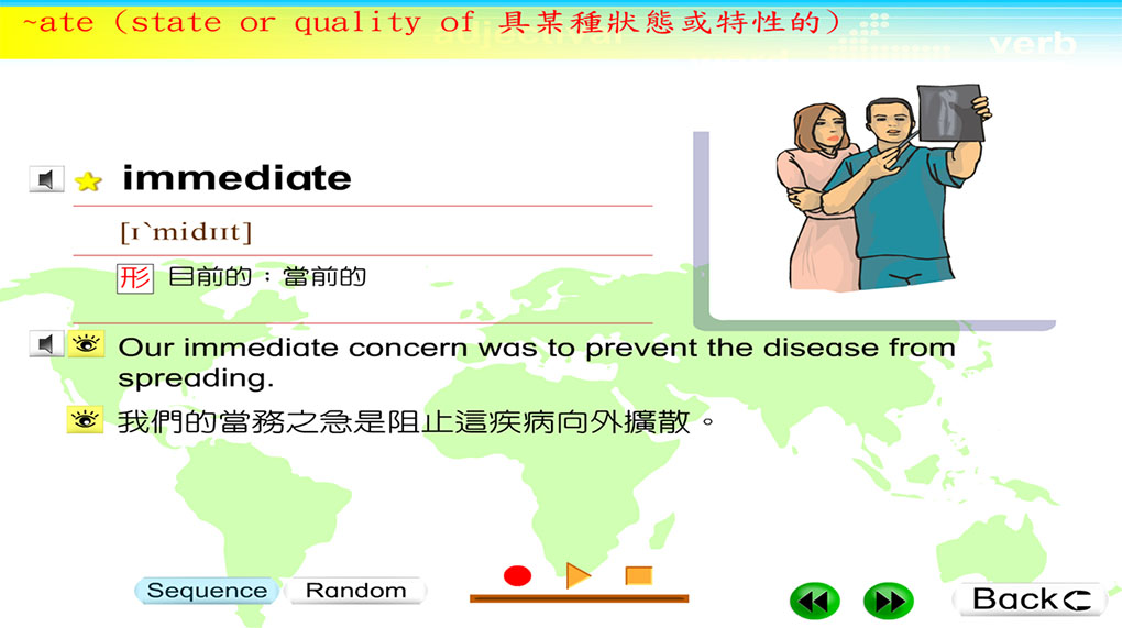 以上為中級版「分類」學習模式下 ~ate 字群中 immediate 的內容畫面。