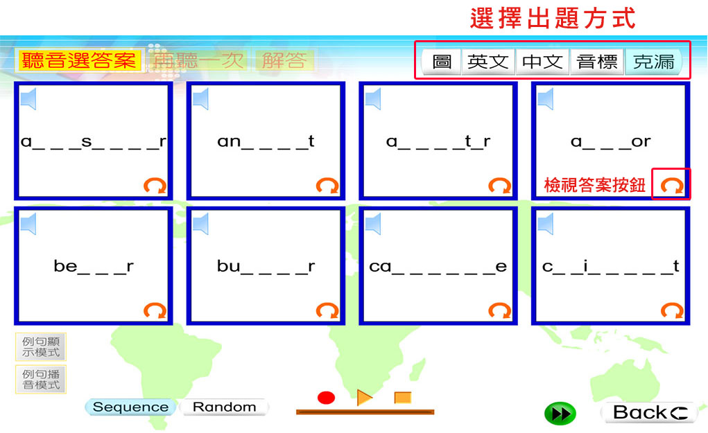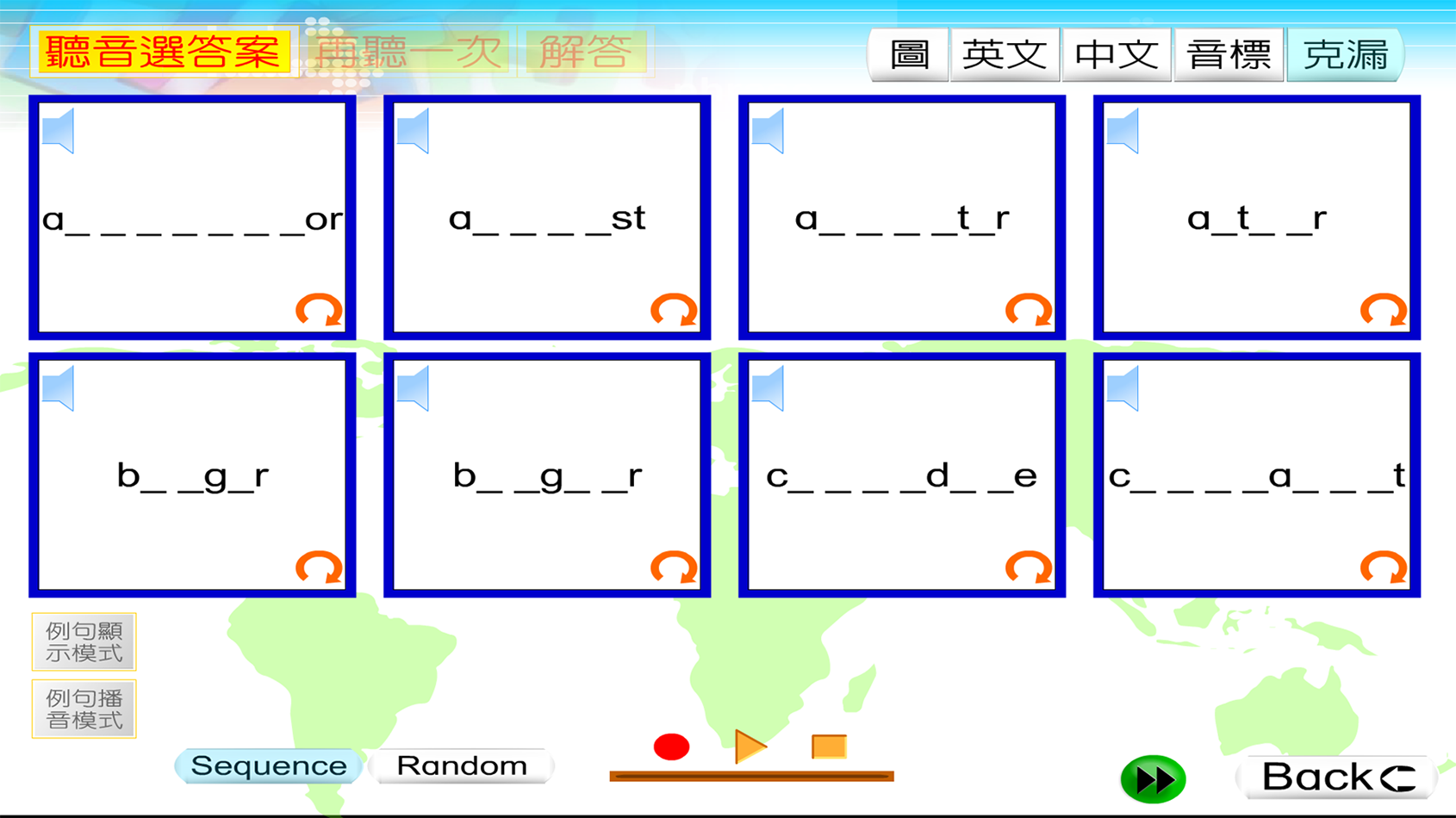 看似簡單的遊戲介面有多種功能和玩法,像克漏字(cloze)、讀音標、中翻英、英翻中、圖案翻牌、無字幕聽句子重講和錄音…等。玩分組PK很刺激唷。