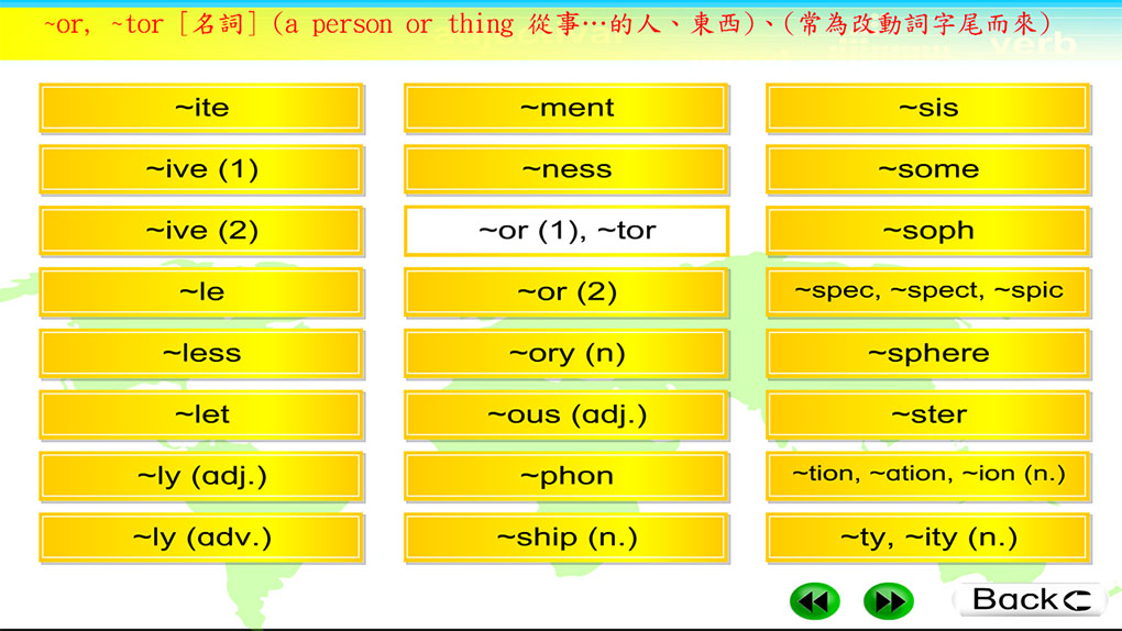 以上所示為「字首、字根、字尾學習模式」下的「字尾」字群按鈕。上方顯示字尾 ( ~or, ~tor) 所代表的意義。