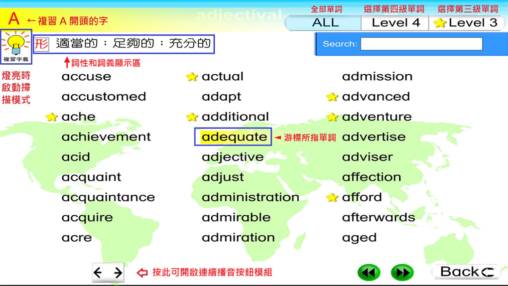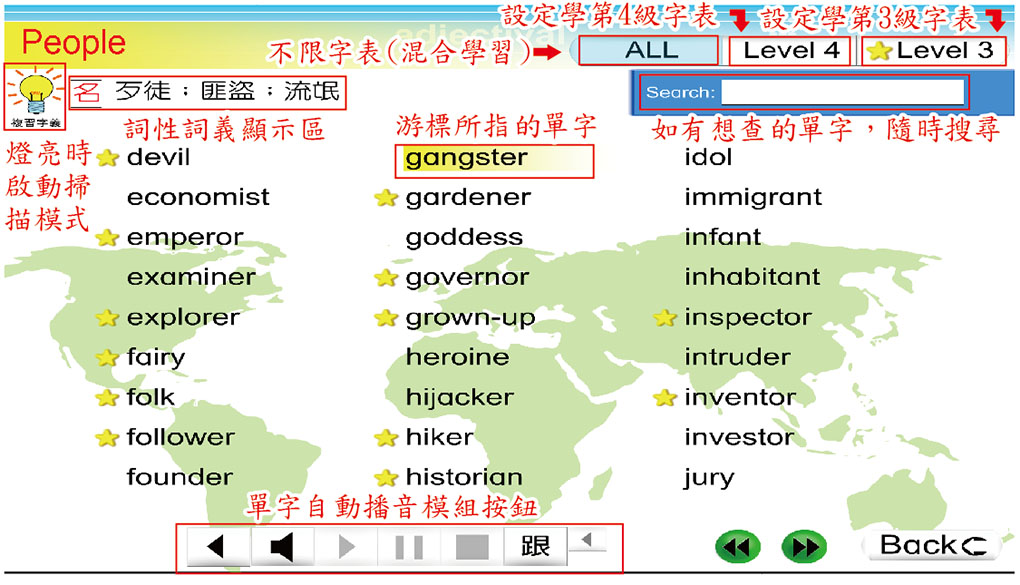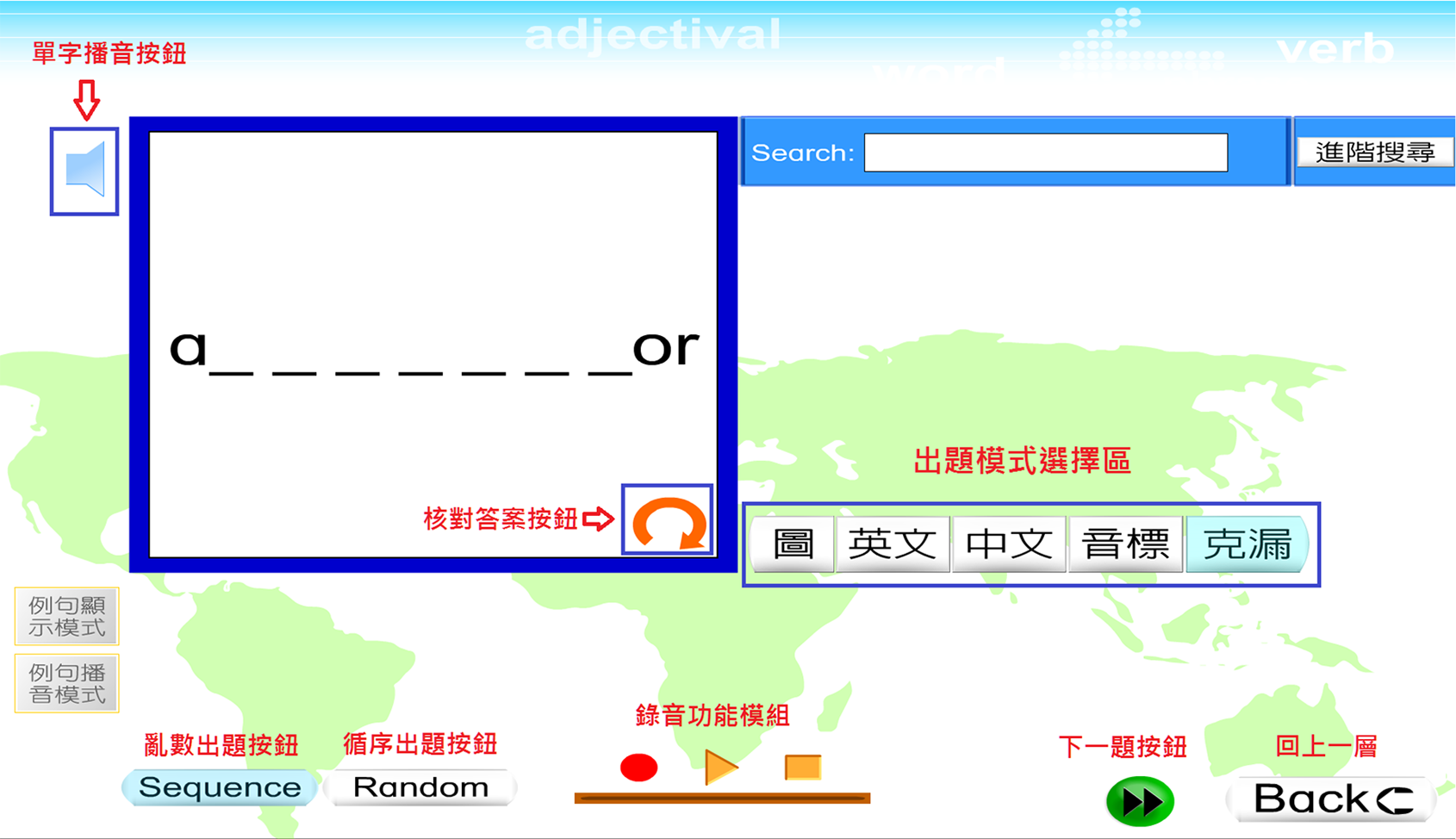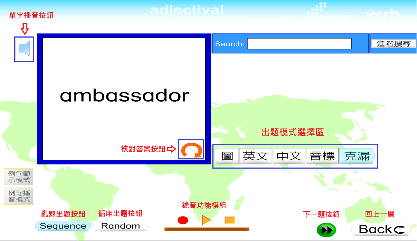 例句為短練習時可以依二個字表等級進行:第一級為「國中會考」必考1200字,其餘第二級為「教育部規定國中應學」及「全民英檢初級」的單字。有錄音功能可以練習標準美式口語;也有字幕屏蔽功能可以練習聽力和廻音跟著說。 <TOP>