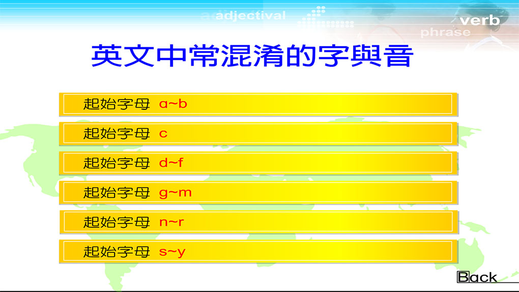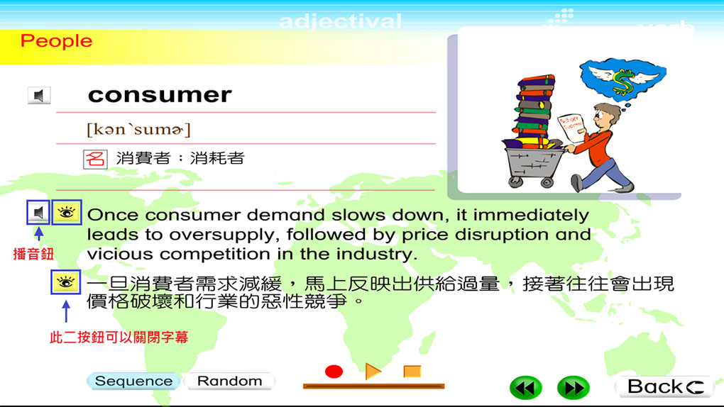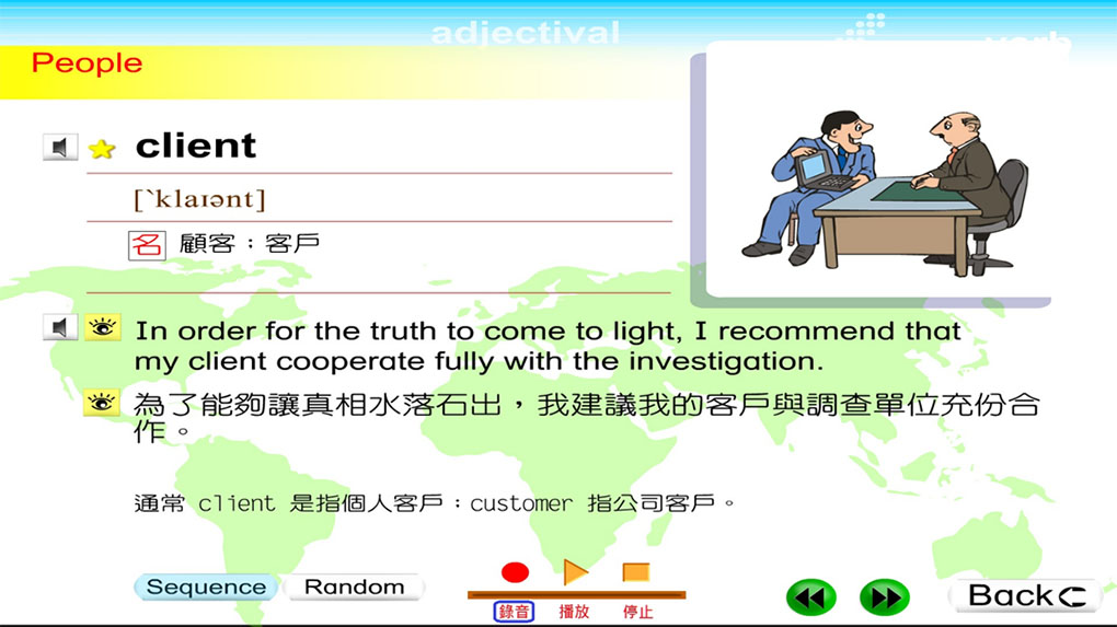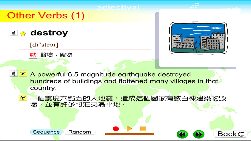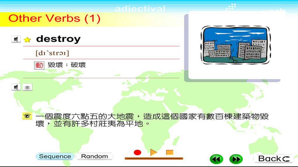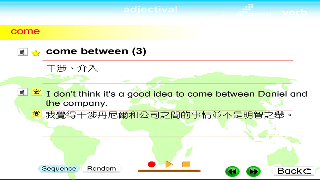 例句為短練習時可以依二個字表等級進行:第一級為「國中會考」必考1200字,其餘第二級為「教育部規定國中應學」及「全民英檢初級」的單字。有錄音功能可以練習標準美式口語;也有字幕屏蔽功能可以練習聽力和廻音跟著說。 <TOP>