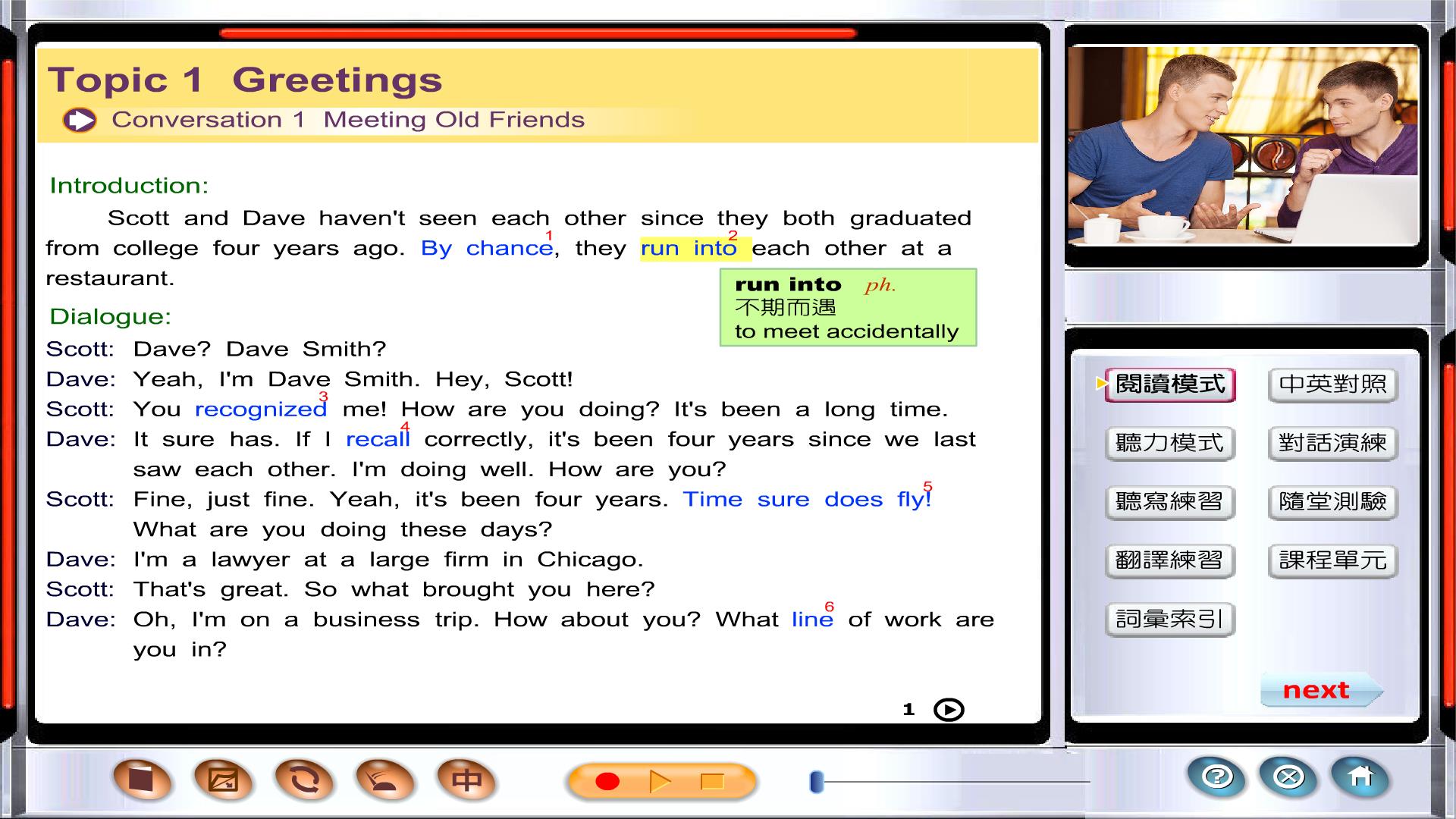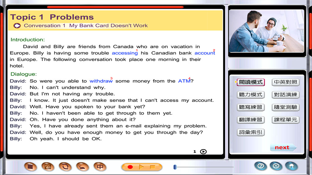 每個單元都能學到一些實用的單字、片語和俚語。全部都有中英、英英解釋及例句,並由專業美籍老師配音。