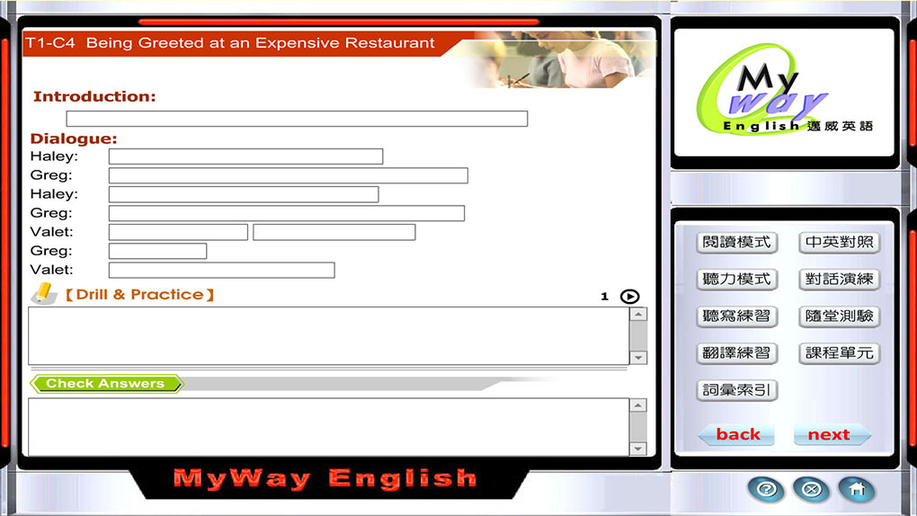 選擇上方一個代表句子的條框,會播出該句子的語音,練習者聽完後先跟著講出來,然後打在中間「Drill & Practice」區域內,該句打完之後按下方「Check Answers」按鈕核對答案。